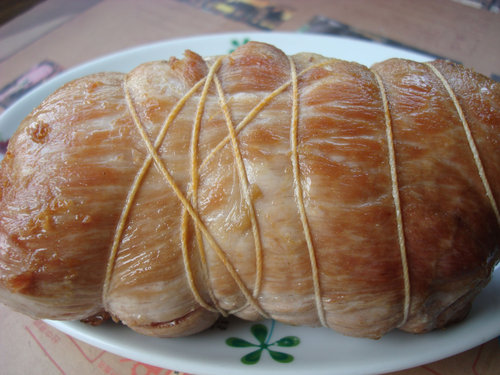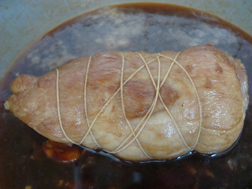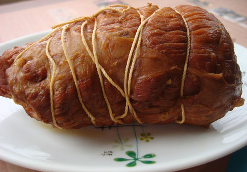 5. 將豬腱肉、撈起放涼,拆掉綁線,食用時、切片、上桌時,灑些油膏、香油跟蔥花。